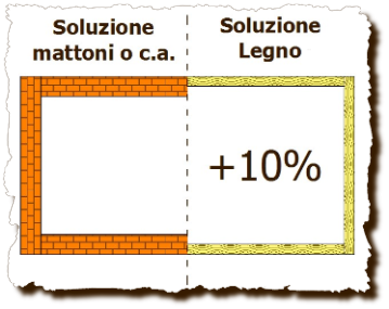 Con una struttura in legno massiccio si raggiungono elevate prestazioni sia termiche (di isolamento dal caldo e dal freddo) che acustiche con pareti di spessore molto ridotto (circa 30 cm). Per ottenere le stesse prestazioni con strutture in muratura tradizionale sono necessarie pareti esterne con uno spessore di 45-50 cm. Questo si traduce in un guadagno netto di superficie interna, importante soprattutto quando si deve costruire rispettando distanze dai confini di proprietą. In una casa monofamiliare di 120-130 mq su due piani, per esempio, con la soluzione in legno si avrebbe un guadagno di superficie di circa 8-10 mq che equivalgono ad una camera in pił ed un pił alto valore commerciale dell'immobile. |